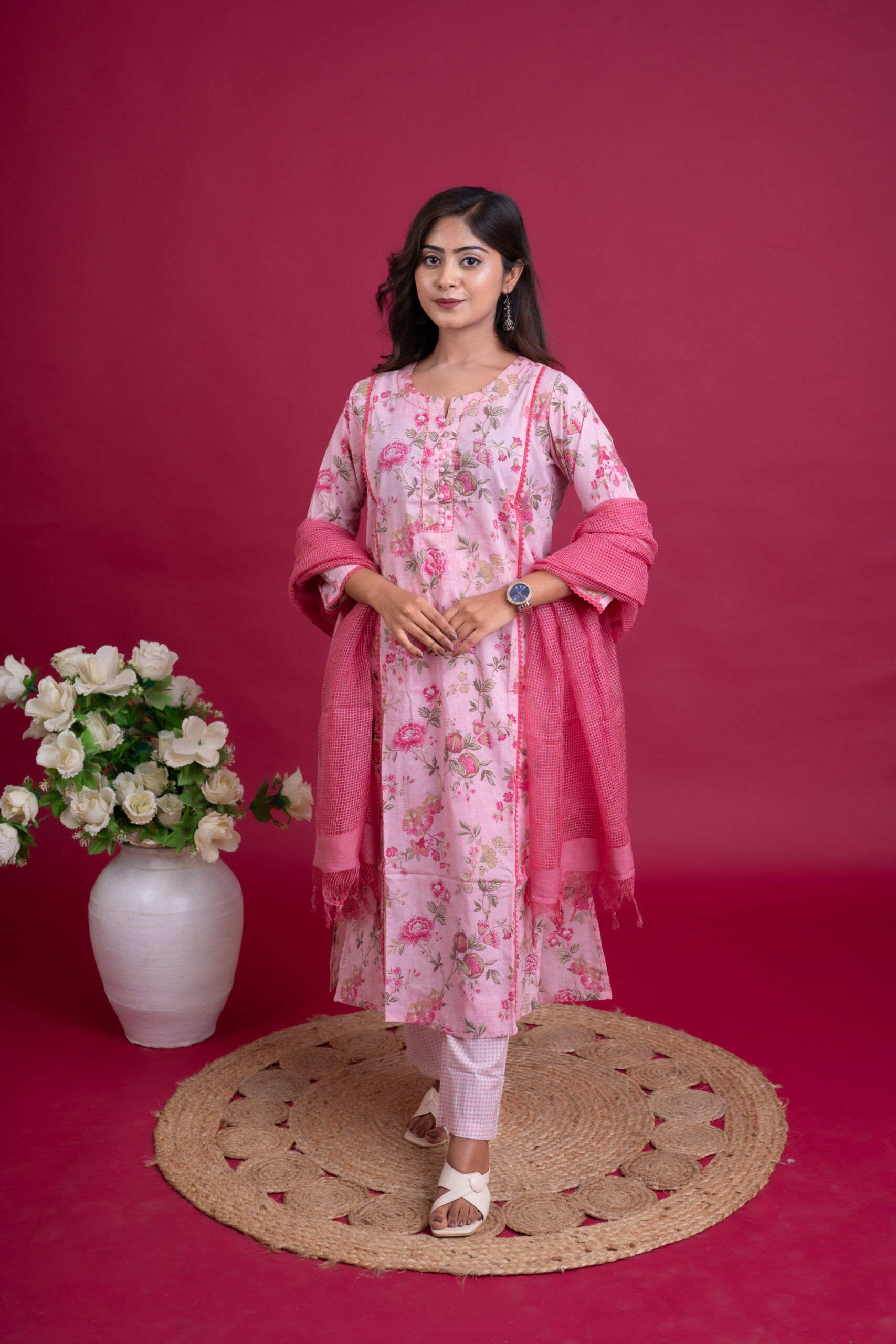 Grace your day with effortless charm in our Rosewood Charm Cotton Suit Set with Kota Doria Dupatta. This soft pink ensemble is adorned with delicate floral prints, giving it a romantic yet refined appeal suitable for both work and occasional gatherings. Crafted from breathable cotton, the kurta features a round neckline with subtle detailing and three-quarter sleeves, promising all-day comfort with style.